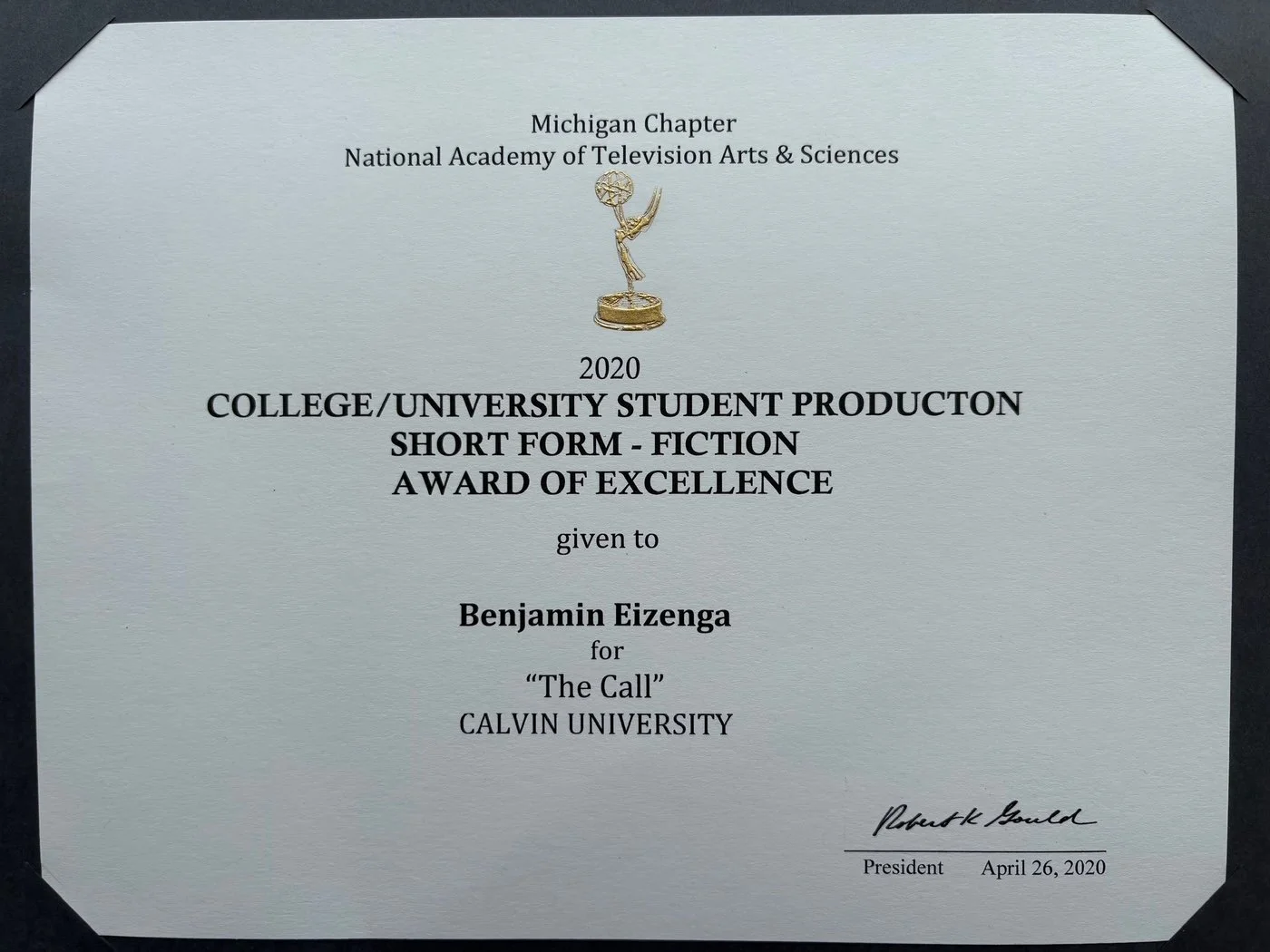Won the 2020 NATAS Michigan Chapter award for Fiction Short Film (Student Emmys)